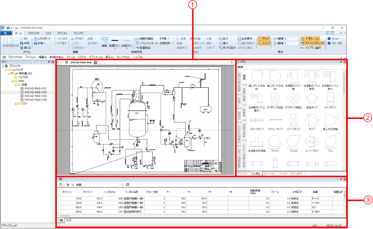 機器や機器付属品(オブジェクト)などはシンボルウィンドウ(②)やメニューから選択して図面編集ウィンドウ内(①)に配置します。