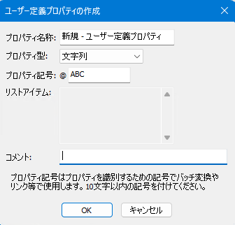 [プロパティ名称]を入力し、[プロパティ型]をドロップダウンリストから選択、プロパティ記号を入力、コンボタイプを選択したらリストアイテムを入力、必要に応じて[コメント]を入力し、[OK]をクリックします。
