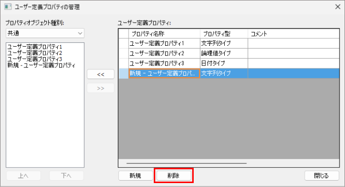 作成したユーザー定義プロパティを削除したいときは、[ユーザー定義プロパティ]一覧の項目を選択して[削除]をクリックします。