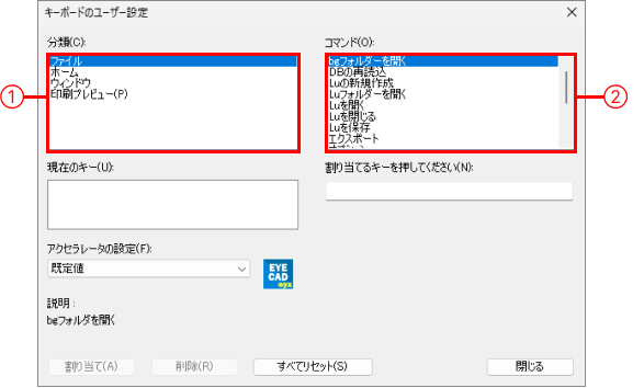 割り当てるキー(①)を設定し、[アクセラレータ設定](②)で[ev10プロジェクト]または[既定値]のどちらかを設定します。