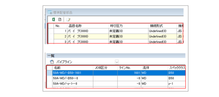 EYECADでは、配管の部品や材質などの仕様を(通常は)記号で1枚のシートで管理します。配管 プラントの液体・気体・粉体などの流体を輸送する管や施設物のこと。