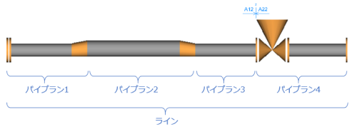 3次元的な形状やレイアウト情報まで含めた場合は配管と呼びます。ノズルや分岐の始点終点管を結ぶ配管をラインとも呼びます。モデリングではラインはモデル単位になります。