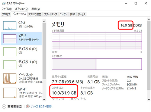 左記の例では、物理メモリは「16.0 GB」コンピューターが使用しているメモリは「10.0 GB」、コミットは「31.9 GB」であることが確認できます。