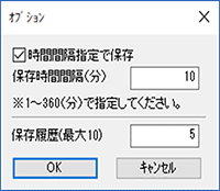 定期的にバックアップを取るには上記メニューの「オプション」を選択し、下のDialogで、「時間間隔指定で保存」にチェックを入れます。