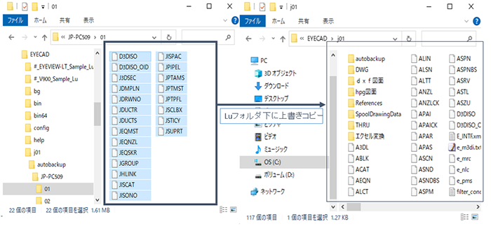 - バックアップファイルを戻すLuフォルダ(jxx)は安全のため事前にコピーを取っておきます。
