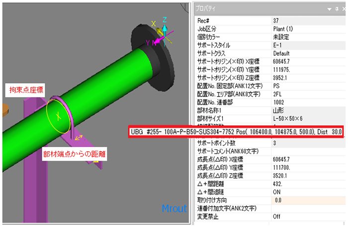 ファスナ1プロパティはファスナ記号+接続配管ラインマーク+ファスナ拘束点座標+部材端点からの距離を表示します。