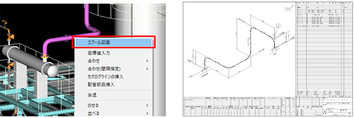 下図の例では配管選択時に「スプール図面」というメニュー項目を追加し、項目選択時にスプール連番プロパティを取得して連番.pdfのファイルを開きます。