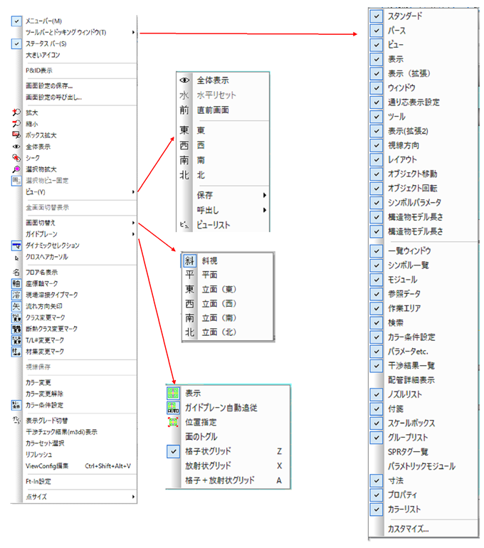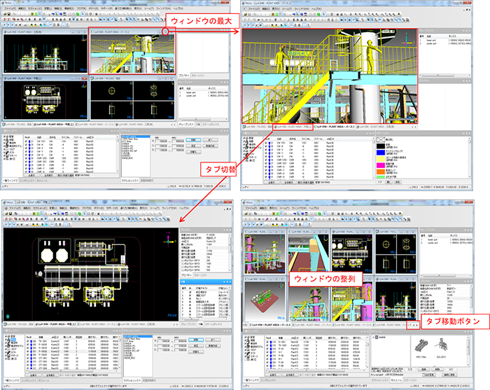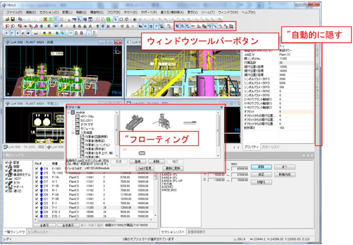 種別 ウィンドウ 説明 マニュアル モデルウィンドウ モデリングウィンドウ プラントモデルの作成、変更、削除を行います。 「モデリングウィンドウ」を参照 機器付属品修正ウィンドウ 機器付属品の作成、変更、削除を行います。 11-01-1-1 パースウィンドウ プラント内部をウォークスルー表示します。 「パースウィンドウ」を参照 ドッキングウィンドウ 一覧ウィンドウ モデル種別ごとの属性一覧表示と表示設定を行います。 「一覧ウィンドウ」を参照 プロパティウィンドウ 選択モデル、コンポーネントの属性を表示します。 「プロパティウィンドウ」を参照 ノズルリストウィンドウ モデルウィンドウで選択した機器のノズルを一覧表示します。 「ノズルリストウィンドウ」を参照 カラーリストウィンドウ カラー設定の表示と編集を行います。 「カラーリストウィンドウ」を参照 シンボル一覧ウィンドウ 機器、構造物のシンボルを一覧表示します。 「シンボル一覧ウィンドウ」を参照 配管詳細ウィンドウ 選択した配管の詳細表示、ポイント間距離表示を行います。 「配管詳細表示ウィンドウ」を参照 モジュールウィンドウ モジュールの登録、配置、編集など行います。 「モジュールウィンドウ」を参照 グループ一覧ウィンドウ グループの一覧、選択、ズーム、画面保存などを行います。 「グループ一覧ウィンドウ」を参照 付箋一覧ウィンドウ 付箋の一覧、選択、ズーム、画面保存などを行います。 「付箋一覧ウィンドウ」を参照 スケールボックス一覧ウィンドウ スケールボックスの一覧、選択、ズーム、画面保存などを行います。 「スケールボックス一覧ウィンドウ」を参照 SPRタグ一覧ウィンドウ SPRタグの一覧、選択、ズーム、画面保存などを行います。 「SPRタグ一覧ウィンドウ」を参照 寸法一覧ウィンドウ 寸法の一覧、選択、ズーム、画面保存などを行います。 「寸法一覧ウィンドウ」を参照 参照データウィンドウ 外部データの取り込みや配置など行います。 「参照Dataウィンドウ」を参照 パラメータウィンドウ 3D形状のパラメータを表示します。 「パラメータetc.ウィンドウ」を参照 作業エリアウィンドウ 選択フィルタでモデルの絞込み表示します。 「作業エリアウィンドウ」を参照 検索ウィンドウ 選択フィルタでモデル検索します。 「検索ウィンドウ」を参照 パラメトリックモジュールウィンドウ パラメトリックモジュールの一覧表示します 「パラメトリックモジュールウィンドウ」を参照 カラー条件設定ウィンドウ 選択フィルタでカラー設定します。 「カラー条件設定ウィンドウ」を参照 図面ウィンドウ 組図ウィンドウ 組図を表示し、セクションの追加、削除、配置等行います。 「組図」を参照