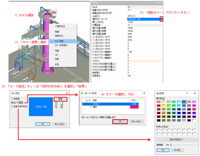 モデルウィンドウはプラントモデルを平面、立面、斜視、パース表示したり機器修正画面を表示します。