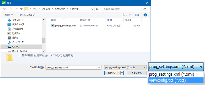 V8以前のViewConfig.txtを読み込む場合は「ファイル名(N):」の右で「viewconfig.txt(*.txt)」を選択してViewConfig.txtを読み込みます。