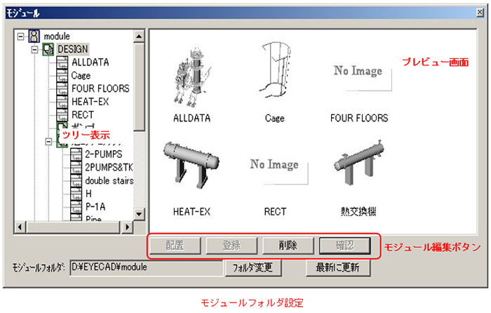 | モジュールフォルダ更新機能 | ツリーを最新表示する。(フォルダをWindowsエクスプローラ等で移動、削除等した場合、この更新ボタンを押すことでモジュールツリーが最新状態に更新されます。) |