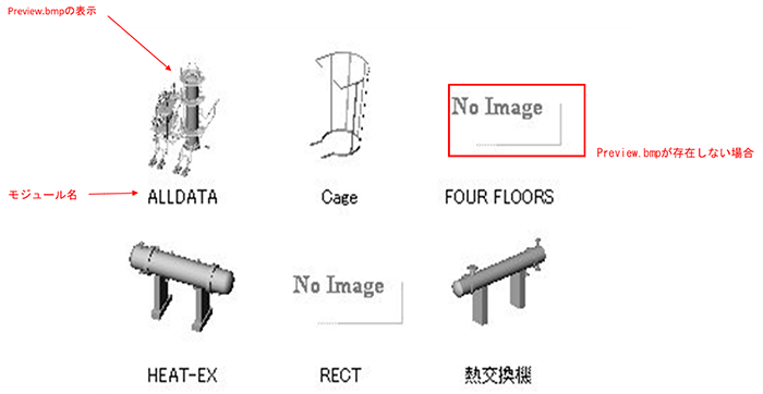 - モジュールフォルダ内にPreview.bmp Fileが存在するとプレビュー画面にそのビットマップFileを表示します。存在しない場合、「No Image」と表示します。