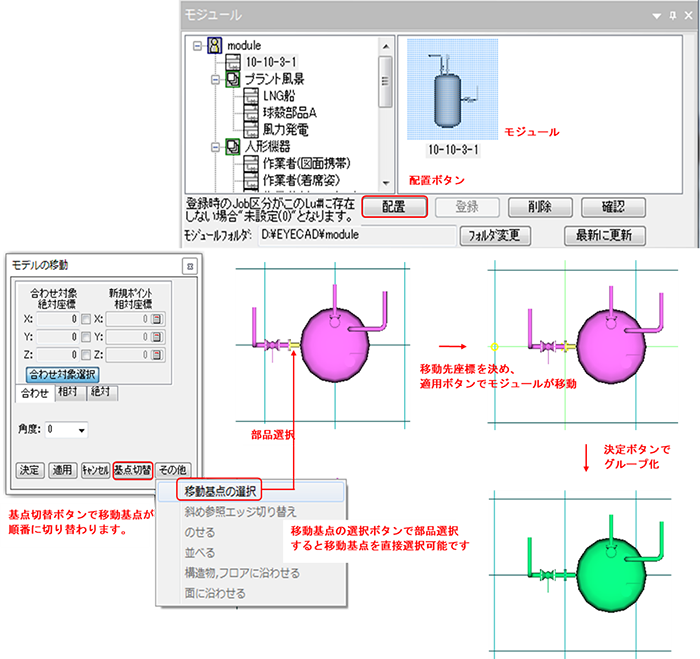 - 適用ボタンを押すと移動基点:○が移動先:×になるようモジュール全体が移動します。