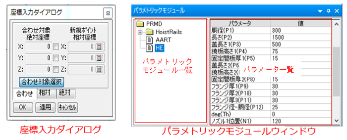 - "編集"メニューの"パラメトリックモジュール"選択で画面に"座標入力ダイアログ"とパラメトリックモジュールウィンドウが現れます。