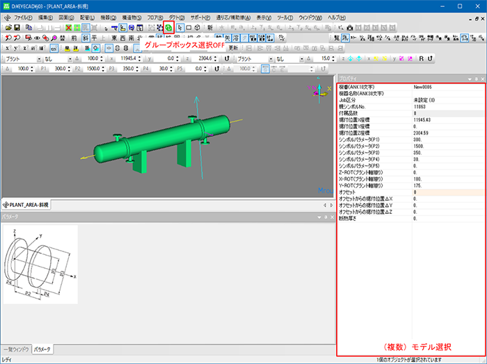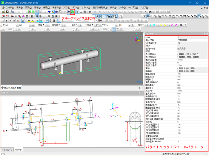 パラメトリックモジュールの選択は「編集」「グループボックス選択」、もしくは「グループボックス選択」ツールバーボタンが有効の場合グループ選択、無効の場合モデル選択となります。パラメトリックモジュールが複数モデルから構成されていれば複数モデル選択グループ選択のときパラメトリックモジュールパラメータが表示され変更可能となります。