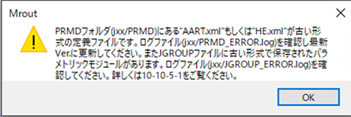 V9.01以前のパラメトリックモジュールを使ったデータでMroutを起動すると必ずこの警告が現れます。