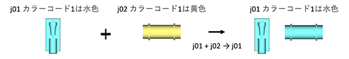 j01 + j02 -> j01に統合すると統合先(j01)のカラーコード1は水色なので統合元j02のカラーコード1のモデルは水色になります。