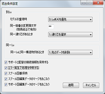 - 本機能は、3DモデルDataでマージ対象の2つのLu#間に同一なDataがある場合の統合方法です。