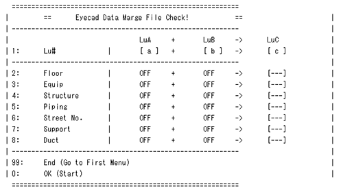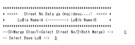 記号 説明 a,b Data Lu# A,B 通り芯名称 記号 処理 選択数値 C 処理を中止 0 通り芯の選択処理 1 両方の通り芯を統合 2 D 指定した通り芯が有効 Lu# 注 )Cで通り芯選択処理(Select Street No)を選択した時のみDの対話処理が行われます。