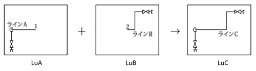 LuA+LuB→LuCのマージにおいて、LuAのラインAの端点(始点または終点)1と、LuBのラインBの端点2が以下の条件をすべて満たす時、マージ後のLuCにおいてラインAとラインBが自動的に接合され、1本のラインCとなります。