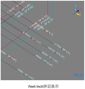 - 通り芯/補助線の数値は画面上に表示されます。Feet-Inch併記も可能です。Feet-Inch併記に関しては「実数値タイプ」を参照