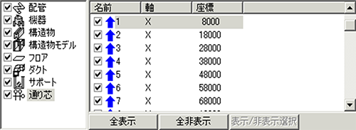 一覧ウィンドウの通り芯をクリックすると、通り芯および補助線の一覧リストが表示されます。
