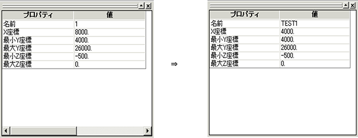 例) プロパティウィンドウの名前をTEST1にX座標を4000にすると、1通りの名前,位置が変わります。
