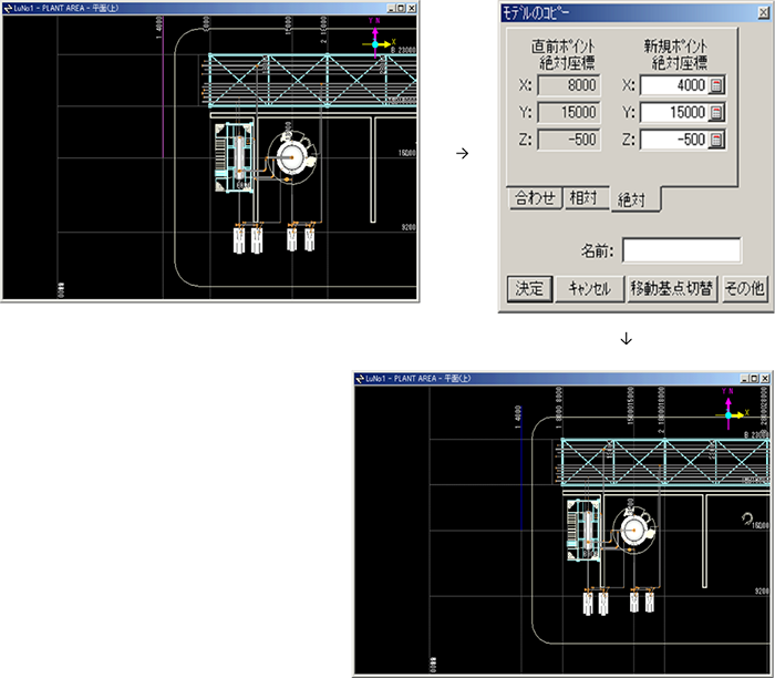 コピー位置は、絶対座標,現在選択している物体からの相対座標、既に入力している物体からの相対座標で指定できます。