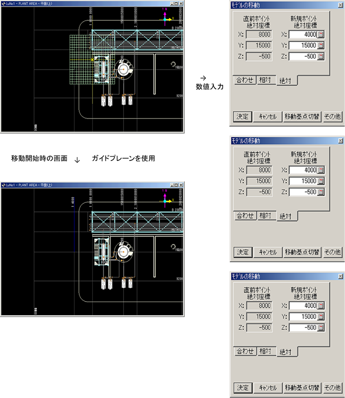 移動位置は、ガイドプレーンを使う方法と、ダイアログから入力する方法があります。