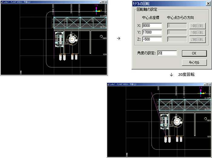 回転実行後に同じ角度で逆回転しても、数値演算精度により完全に元の位置に戻らない場合があります。(一覧リストの軸が斜めになったままです。)