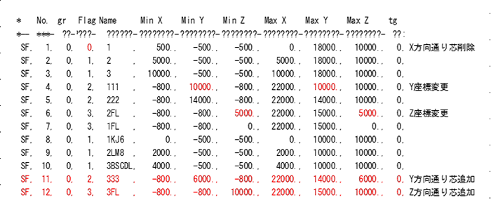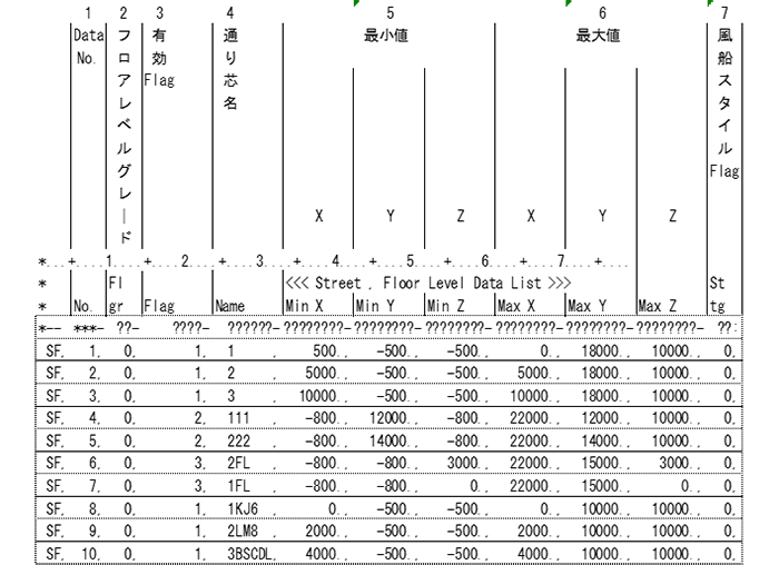 Flag エラーCode エラーMessage内容 1 1001 X軸のmin・max値が等しくない。 1002 Y軸のmin・max値の差がない。 1003 Z軸のmin・max値の差がない。 2 2001 X軸のmin・max値の差がない。 2002 Y軸のmin・max値が等しくない。 2003 Z軸のmin・max値の差がない。 3 3001 X軸のmin・max値の差がない。 3002 Y軸のmin・max値の差がない。 3003 Z軸のmin・max値が等しくない。 6 6001 X軸のmin・max値の差がない。 6002 Y軸のmin・max値の差がない。 6003 Z軸のmin・max値の差がない。 7 Sttg 風船スタイルFlag ○ 通り芯のスタイルFlagを制御します。(将来)