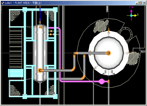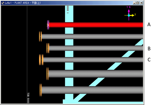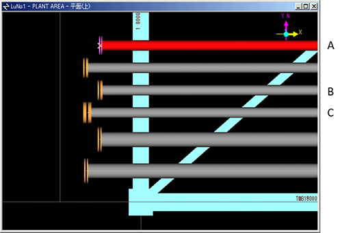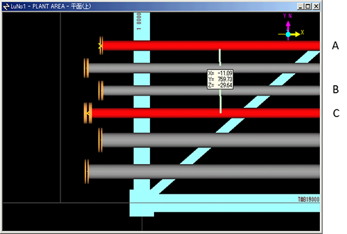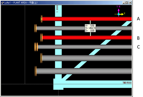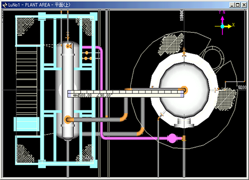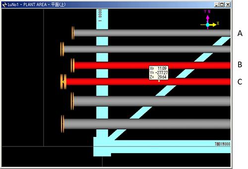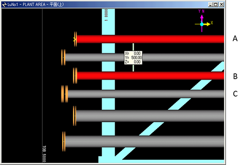 配管A→Bの順にマウス左ボタンをクリックすると、配管A-B間の距離を表示します。