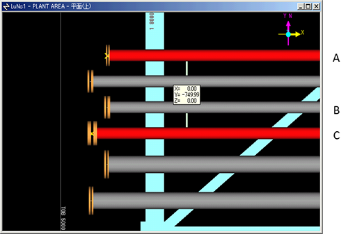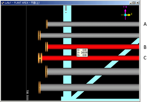 さらに配管Aをマウス左ボタンでクリックすると、配管C-A間の距離を表示します。