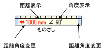 - 「ものさし」の長さ固定モード(長さ赤色表示)の場合、また「ものさし」の角度固定モード(角度赤色表示)の場合には、固定されていない値のみ変化します。