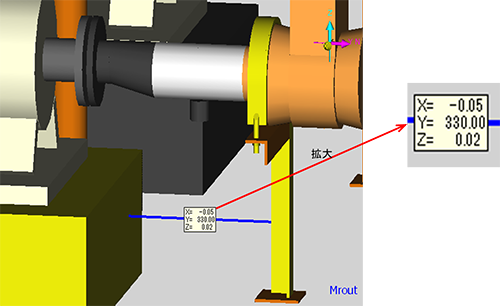 マウスの左ボタンでモデリングウィンドウ内の2つのモデルをクリックすると、線分が発生し、モデル間の距離(X,Y,Z)が表示されます。