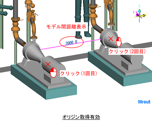 通常、モデルクリックしたポイント間の距離が表示されますが、「オリジンの取得」が有効であればモデルオリジン間距離を表示します。