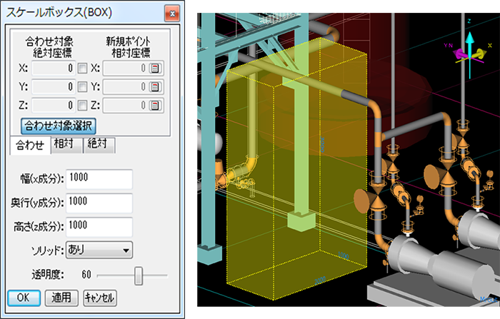 座標、幅、奥行、高さ、透明度を指定してスケールボックス(BOX)を作成します。