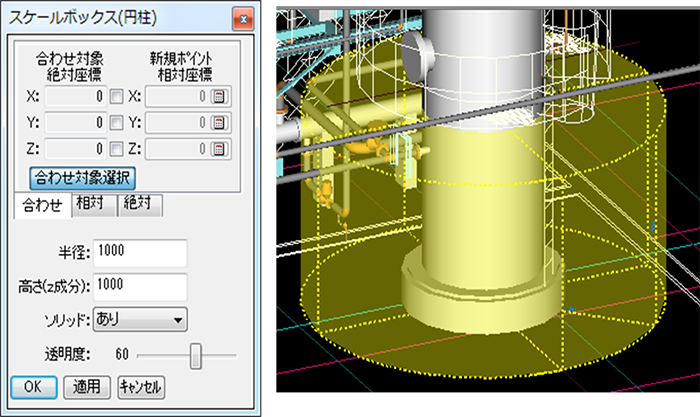 座標、半径、高さ、透明度を指定してスケールボックス(円柱)を作成します。