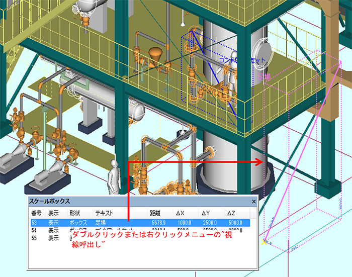 スケールBoxが表示されるとそのスケールボックスが選択状態になります。選択状態で「ツール(T)」→「スケールボックス」→「表示切替」もしくはマウス右クリックメニュー「表示切替」で「2点間距離」、「Box」、「円柱」の切替が可能です。