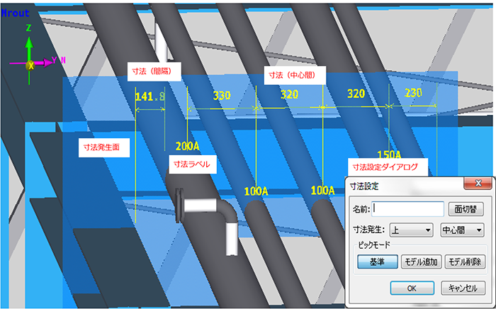 寸法機能は画面内で複数選択したモデル間の(間隔と中心間)寸法を発生させる機能です。