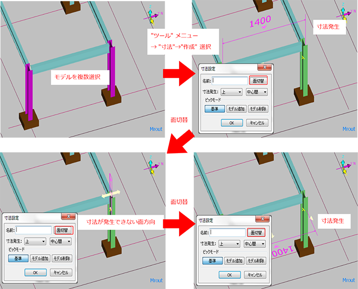 寸法設定Dialogで寸法を発生する面や方向、対象モデルの追加、削除など変更することができます。