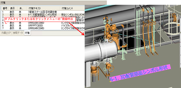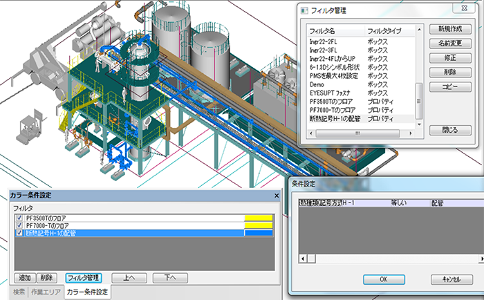 例えば、断熱記号がH-1のフィルタを作成し、そのフィルタを使って断熱記号がH-1の配管のカラーを設定したり、検索で流体記号がCWの配管をリストに表示して選択、表示拡大したりすることができます。