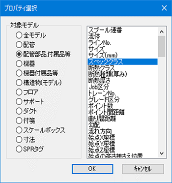 - プロパティ選択ダイアログが現れ、左側の対象モデルで"配管"を選択し、右側のリストで"流体"を選択し"OK"