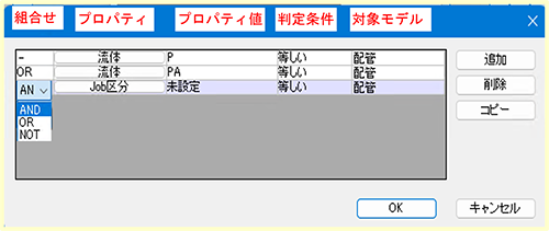上図の条件設定は、"流体"プロパティが"P"と"PA"の配管で"Job区分"プロパティが"未設定"のフィルタとなり以下の通り設定します。