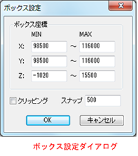 - Box座標にはBoxの最小座標と最大座標が表示されます。この座標値とBoxドラッガは連動します。