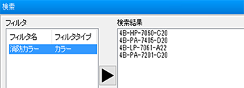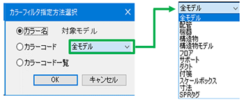 カラーフィルタは「カラー名」「カラーコード」「カラーコード一覧」から選択、対象モデルを選択してOKで以下のダイアログが現れます