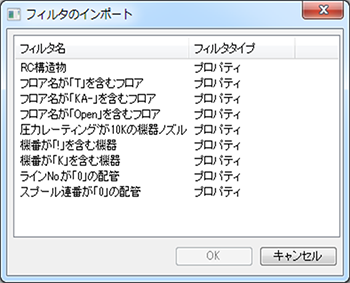 例)配管、機器を"全て"、フロアを"個別"、その他を"なし"にすると以下のように"全配管"と"全機器"というフィルタと各フロア名の個別フィルタが作成されます。