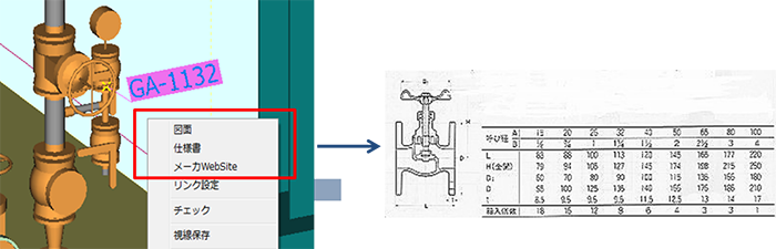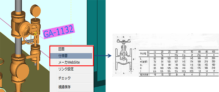 - リンクしたドキュメントは、付箋またはスケールBoxまたは寸法を選択したときの右クリックメニューにそのリンク名が現れます。そのリンク名を選ぶとそのドキュメントを呼び出すことができます。