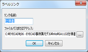 付箋またはスケールBoxまたは寸法を選択し"ツール(T)"→"リンク設定"もしくは右クリックメニューの"リンク設定"でリンク設定ダイアログが現れます。追加ボタンでラベルリンクダイアログが現れるので、リンク名をとFileパスまたはURLアドレスを入力します。