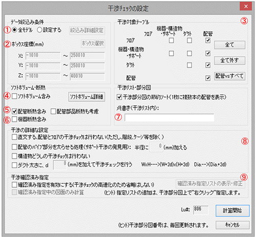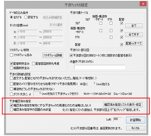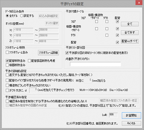 設定条件を変更したいときメニューの〔ファイル(F)〕-〔設定条件〕をClickし、干渉チェックの設定Dialogを表示してください。設定変更後に再度、[計算開始] ボタンを押してください。
